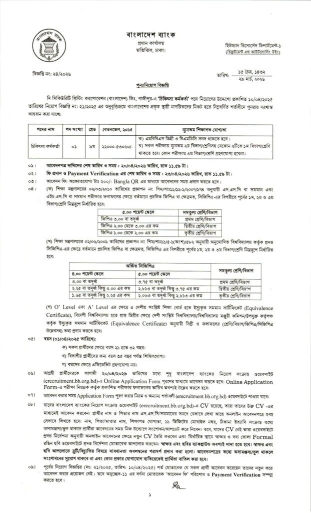 বাংলাদেশ ব্যাংকের নিজস্ব চিকিৎসার সুবিধার্থে এই পদে নিয়োগ দেওয়া হচ্ছে।